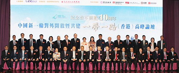中央政府駐香港聯絡辦副主任黃蘭發指出,支持香港參與和助力「一帶一路」建設,有利於推動形成全面開放的新格局,有利於香港融入國家發展大局,實現和內地優勢互補,共同發展。站在改革開放40周年的新起點上,隨着廣深港高鐵香港段、港珠澳大橋開通,香港同胞一定能把握國家新一輪改革開放的歷史機遇,堅守「一國」之本,善用「兩制」之利,發揮香港所長,服務國家所需。
