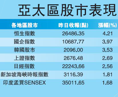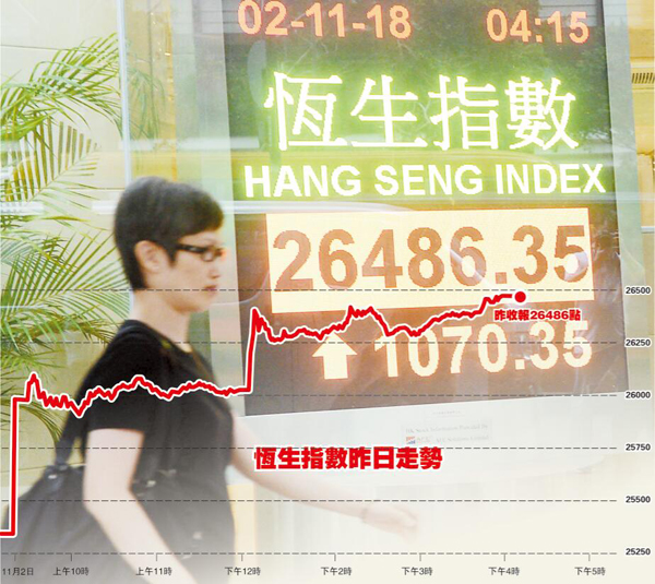 市場憧憬貿易戰有轉機,亞太區股市亢奮,恒指昨天更爆升過千點,創近十年最大單日點數升幅,而4.21%的上漲幅度也3年來最大單日比例,更扭轉連跌五周頹勢。上證指數大升2.7%;日經平均指數大升2.6%,本周累升5%,終止4連跌;韓國首爾綜合指數大升3.5%,台灣加權指數則升0.63%。歐洲股市早段上揚。