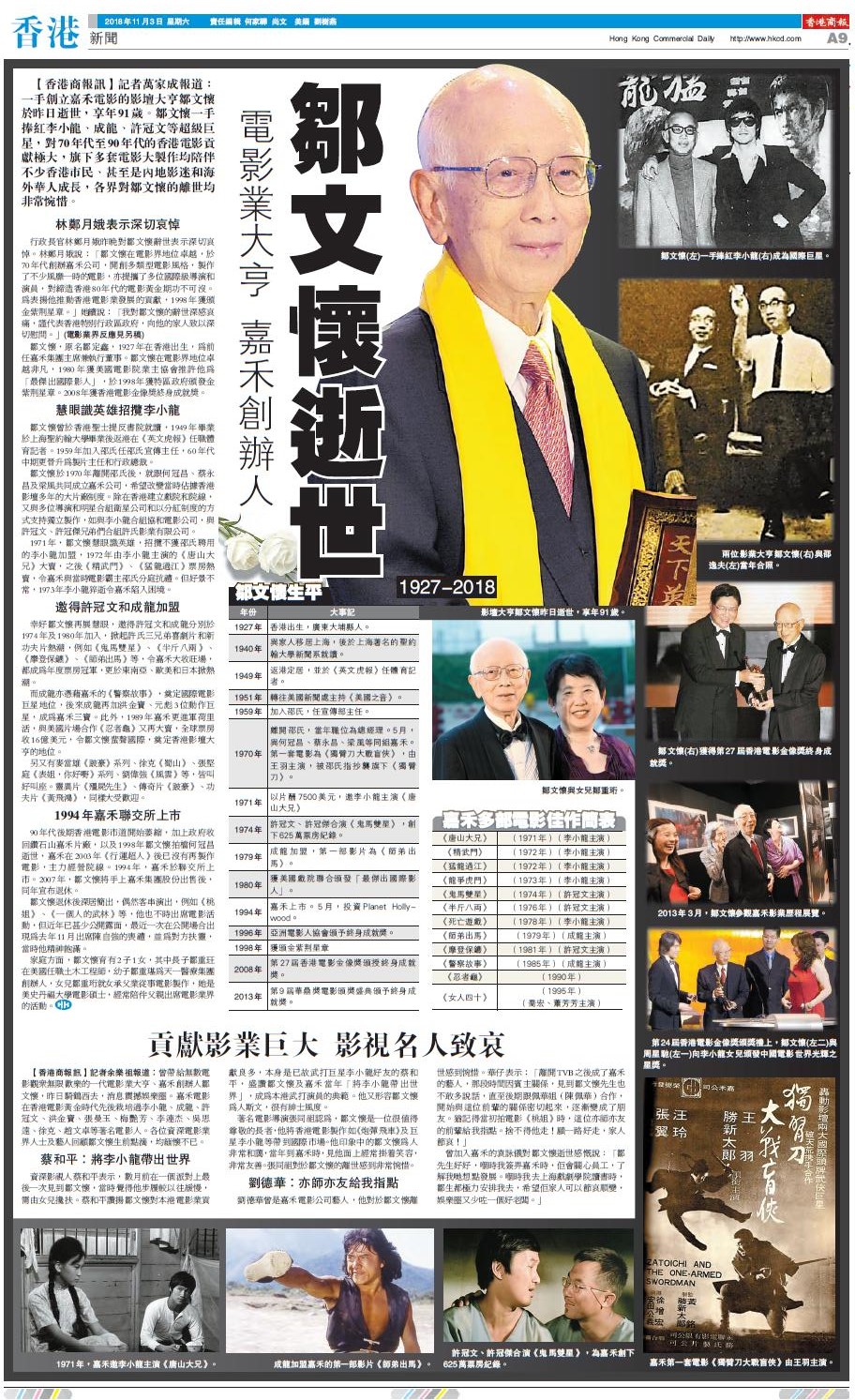【香港商報網訊】記者萬家成報道:一手創立嘉禾電影的影壇大亨鄒文懷於昨日逝世,享年91歲。鄒文懷一手捧紅李小龍、成龍、許冠文等超級巨星,對70年代至90年代的香港電影貢獻極大,旗下多套電影大製作均陪伴不少香港市民、甚至是內地影迷和海外華人成長,各界對鄒文懷的離世均非常惋惜。