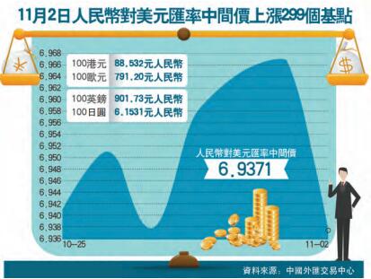 11月2日晚間,午後勢如破竹的人民幣短線走低。離岸人民幣對美元一度跌破6.88關口,日內漲幅收窄至約360點。