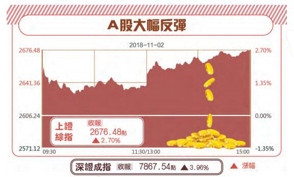 截至收盤,上證綜指報2676點,漲幅2.7%,成交2079億元人民幣;深證成指報7867點,漲幅3.96%,成交2434億元;中小板指報5317點,漲4.72%;創業板指報1348點,漲幅4.82%。