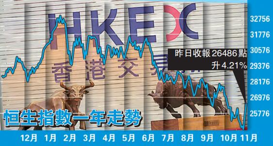 香港股市也是表現強勁,從周三開始止跌反彈,周四重返兩萬五,周五更是借中美貿易戰擔憂紓緩和人民幣大漲而重返兩萬六,裂口高開564點後,上午略有回順,午後擴大漲幅,回補了10月11日的缺口,漲幅超過1000點,總算是讓連續下跌6個月的大市重新看到一些希望,單日上漲4.21%,支持恒指結束5周連跌,全周反彈1768.72點。騰訊(700)在連續下跌5個月後,本周終於有明顯反彈,最後3日累積了20%的漲幅,重返300元,給大市帶來支持。友邦(1299)亦大幅走高,後3日將周升幅擴大至8.16%。這些重磅藍籌股的反彈,給大市增添動力,而且成交重新活躍。