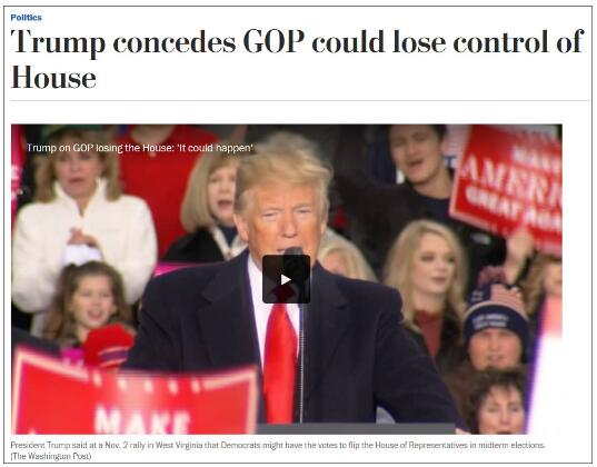 当地时间周五,美国总统特朗普出席一个竞选集会及发表讲话时,首次公开承认共和党可能无法在国会众议院内保住大多数议席,失去众议院的控制权。