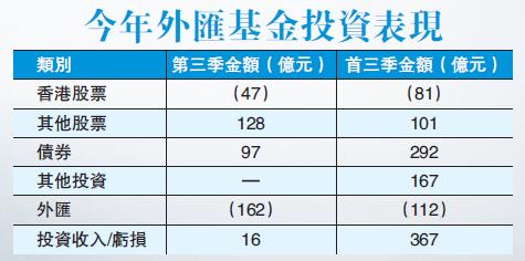 首三季外匯基金投資收益367億元,其中香港股票虧損81億元,其他股票收益101億元,債券收益292億元,外匯虧損112億元,6月底止其他投資收益則為167億元。第三季自外匯基金支付予本港財政儲備的款項107億元,首三季合共329億元。