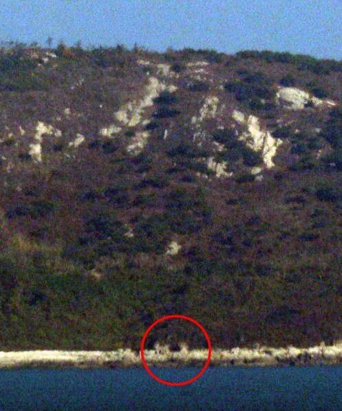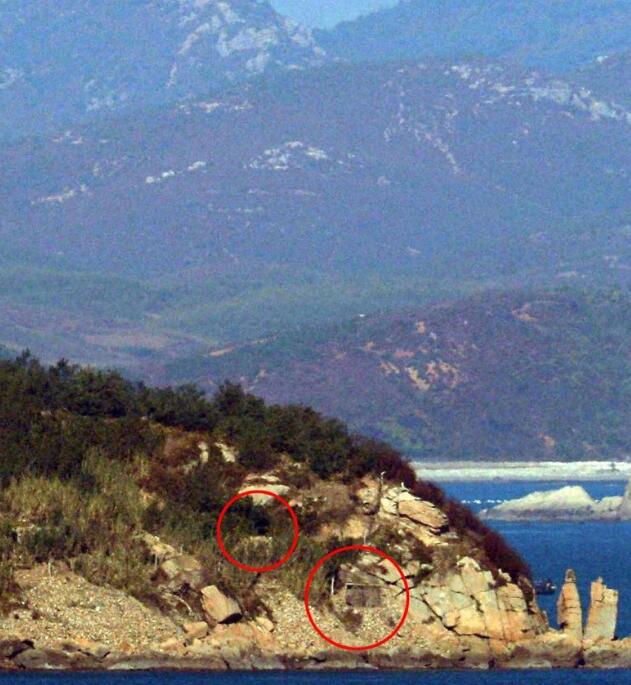 11月1日上午,从韩国延坪岛望乡瞭望台瞭望朝鲜大睡鸭岛海岸,其海岸炮阵地的一处坑道处于敞开状态。(韩联社)