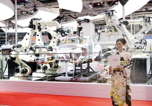11月5日,一名那智不二越公司的工作人员站在用于汽车制造的焊接机器人展示台前。 新华社