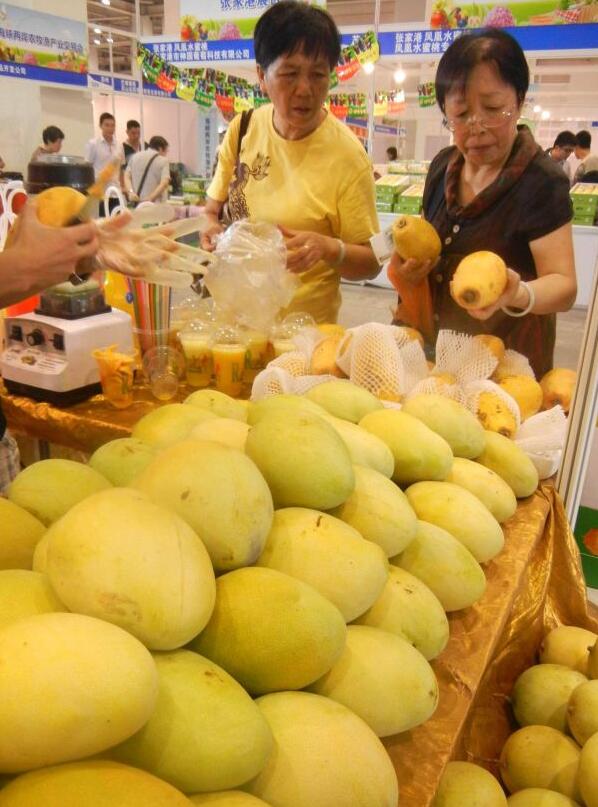 2014年,两名大陆居民在海峡两岸农牧渔产业交易会上选购台湾水果。 新华社资料图