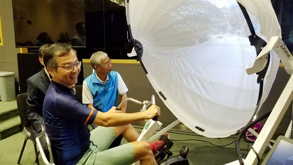 林正財試用「BikeAround自由遊健身單車」。記者 何加祺攝