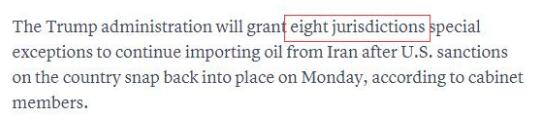 由于蓬佩奥2日首度宣布将重启对伊朗制裁案时,则是以“8个管辖区”(jurisdictions)统称在列的8个进口方,前后以不同定位称呼台湾,引人关注。
