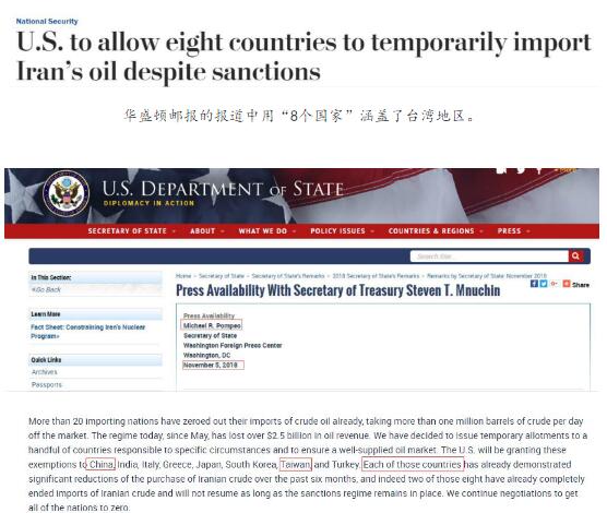 台湾媒体8日报道称,美国国务卿蓬佩奥5日与美国财政部长努钦召开记者会,宣布对伊朗重启制裁,在透露将对8个进口方予以豁免时,以“国家”称呼台湾。