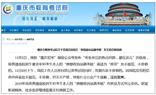 11月2日,重庆市教育考试院“重庆招考”微信公众号发布“考生关注的热点问题,都在这儿”的信息,将普通高校招生要求中对考生本人的“思想政治品德考核”表述为“政审”是不规范、不准确的。11月8日下午,我院工作人员在回答记者电话询问时,答复也是不准确的。因我院发布的信息内容表达不规范、不准确,把关不严格,导致社会公众产生误解,谨致歉意。