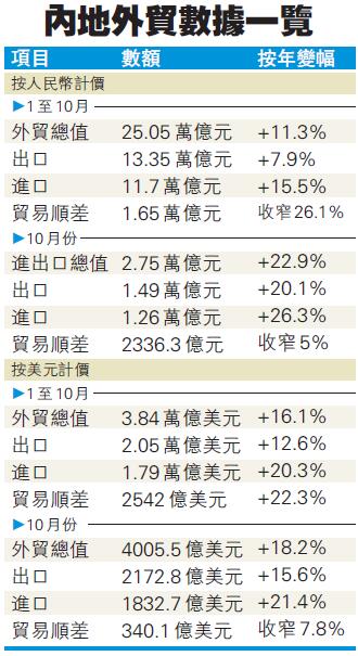 按美元計價,前10個月,內地進出口總值3.84萬億美元,增長16.1%。其中,出口2.05萬億美元,增長12.6%;進口1.79萬億美元,增長20.3%。10月份,進出口總值4005.5億美元,增18.2%。其中,出口2172.8億美元,增長15.6%;進口1832.7億美元,增長21.4%。