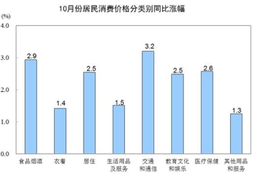 2018年10月份,全国居民消费价格同比上涨2.5%。其中,城市上涨2.5%,农村上涨2.6%;食品价格上涨3.3%,非食品价格上涨2.4%;消费品价格上涨2.8%,服务价格上涨2.1%。1-10月平均,全国居民消费价格比去年同期上涨2.1%。