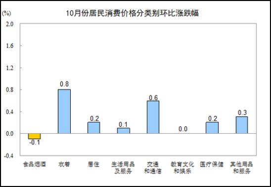 10月份,全国居民消费价格环比上涨0.2%。其中,城市上涨0.2%,农村上涨0.2%;食品价格下降0.3%,非食品价格上涨0.3%;消费品价格上涨0.3%,服务价格持平。