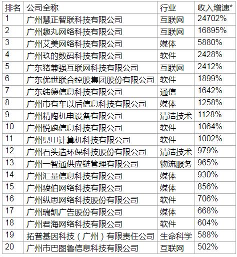 荣登本年度“广州20强”三甲的企业分别为广州慧正智联科技有限公司、广州趣丸网络科技有限公司及广州艾美网络科技有限公司。他们在过去三年的平均增长率分别为24,702%、16,895%和5,880%。此外,在今年入选“广州20强”的企业中,产业分布鲜明,上榜企业以软件、媒体、互联网企业为主,合计占比75%。同时,就创新方向而言,本年度获选“广州明日之星”的21家企业多集中在“互联网平台的未来发展”、“数字化休闲娱乐产业”、“智能化生产、节能、高技术附加值产业”以及“数字媒体时代”四大领域。成为“广州20强”和“广州明日之星”的企业将自动成为“中国高科技高成长50强”(简称“中国50强”)和“中国明日之星”的候选企业,并将于今年11月20日与来自全国其他城市的入围企业一起,参与全国增长最快、最具发展潜力的高科技企业角逐。