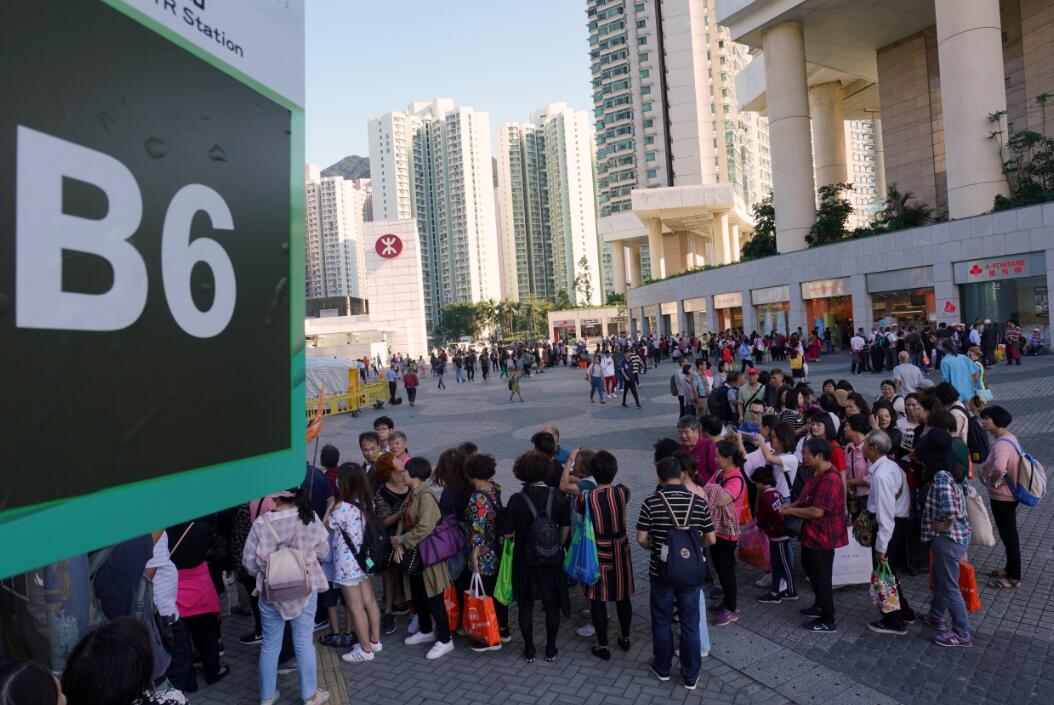 眾多內地旅客在東涌B6巴士站排隊候車。中通社