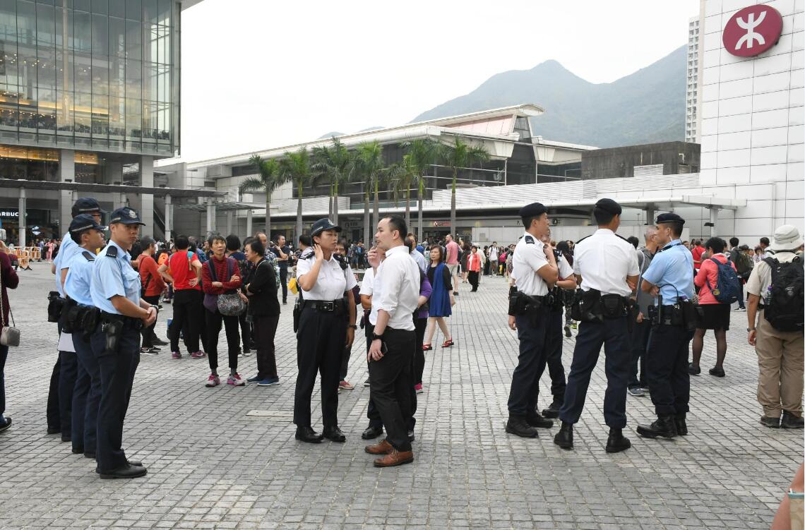 在東涌港鐵站外,聚集不少旅行團,車站附近亦有不少警員巡邏及維持秩序,也有警員查閱內地領隊和本港導遊的證件。