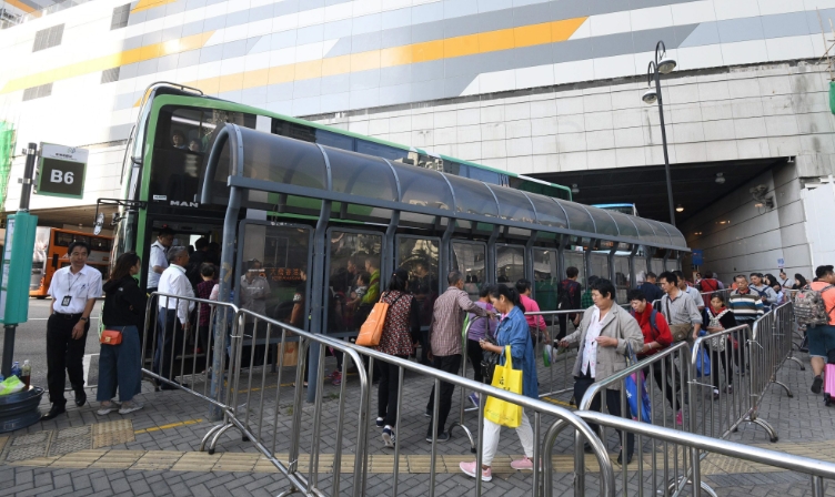 東涌港鐵站外,全日都有不少旅客團與內地旅客聚集,由東涌開往大橋香港口岸的B6巴士站繼續大排長龍,巴士公司架起鐵馬,加派職員在場協助,同時安排兩輛巴士上客疏導人潮。