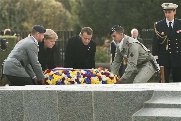 马克龙与默克尔为一战阵亡士兵献上花圈。