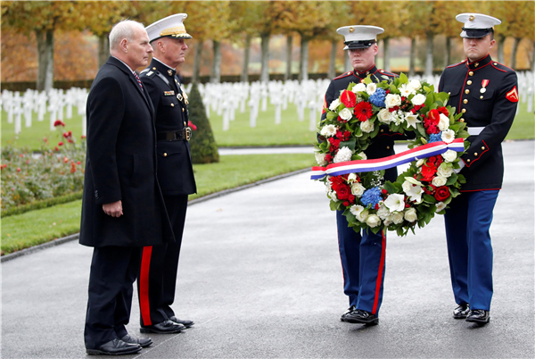 美国白宫幕僚长凯利(左)和美国参谋长联席会议主席邓德福将军代特朗普前往一战美军公墓。