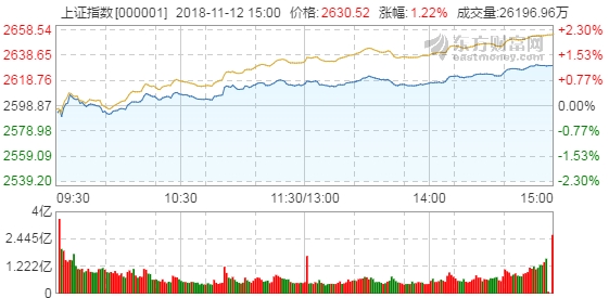 【香港商报网讯】11月12日消息,今日两市小幅低开,随着市场人气回暖,权重题材纷纷活跃,两市逐渐上行,沪指涨超1%,深成指走势与沪指基本一致,创业板指表现强于沪指,大涨超3%。创投、壳资源股、高送转表现强势,创低价股掀涨停潮,ST长生再度涨停,妖股恒立实业(000622)涨停13天12板,两市超150股涨停。截止收盘,沪指报2630.52点,涨幅1.22%,深成指报7832.29点,涨幅2.40%;创指报1368.79点,涨幅3.47%。