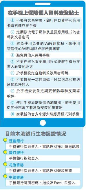其實,受規管的金融機構越來越重視用戶的信息安全,將不斷更新的科技用於保護客戶個人信息上。例如汇豐銀行、渣打香港及花旗香港用戶可通過指紋登入手機銀行,汇豐同花旗香港亦在電話理財環節中使用聲紋認證手段。