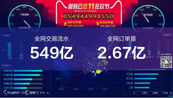 【香港商报网讯】记者黄凤鸣报道:记者从香港上市公司金蝶集团了解到,金蝶旗下专注于电商SaaS的服务商,管易云创业十年,2018年11月11日,管易云全网交易额549亿元人民币(下同),同比增长20.4%;全网订单量2.67亿单,同比增长24.2%。天猫预测,2018年双十一物流订单量预计超10亿单,大致相当于美国20天的包裹量、英国4个月的包裹量,这些包裹连接起来可以绕地球赤道7圈多,这其中每10个包裹有2个是经由管易云的系统应用处理并发出。