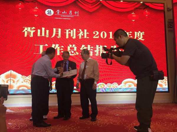 会上,胥山月刊社向受聘为刊社担任各种荣誉职务的族彦精英和各联络处颁发证书牌匾和社旗。其中,来自美国三藩市的85岁高龄的伍璇灿获颁功勋奖。