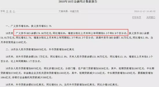 昨晚,央行发布2018年10月金融统计数据报告。报告显示,10月末,广义货币(M2)余额179.56万亿元,同比增长8%,预期8.4%,前值8.3%。