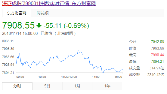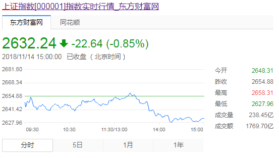 11月14日消息,早盘三大股指低开 。受外盘影响,石油化工板块大幅低开,同时航空股集体大涨。受此影响,指数震荡下行,市场今日分化严重,个股跌多涨少。随后,ST板块跳水,券商、保险、白酒板块大幅走弱,拖累市场人气。临近上午收盘,两市股指回落之后逐步回暖,随着券商板块的走强,创业板指数盘中一度翻红。板块个股方面,创投板块大幅分化,随后经过调整后再度走强;海南、钢铁、机场航运板块延续盘初强劲之势。午后,两市冲高回落,午后两市指数小幅回暖。但随着券商、银行等权重板块的迅速下挫,拖累市场人气,三大股指小幅跳水。股指午后跳水,上证50跌逾1.4%,沪指、深成指跌幅扩大。尾盘,三大指数弱势震荡,以白酒、石油化工为首的权重板块开始持续走弱,创投、民航依旧涨幅居前,但板块内部分化严重,个股总体跌多涨少,北向资金流出明显,市场人气较差。截止收盘,沪指报2632.24,跌0.85%,;深成指报7908.55,跌0.69%;创指报1385.73,跌0.45%。