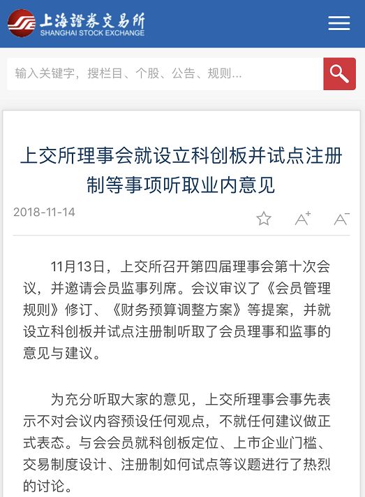 在另一则题为“上交所理事会就设立科创板并试点注册制等事项听取业内意见”的消息稿中,上交所证实了召开了相关会议。11月13日,上交所召开第四届理事会第十次会议,并邀请会员监事列席。会议审议了《会员管理规则》修订、《财务预算调整方案》等提案,并就设立科创板并试点注册制听取了会员理事和监事的意见与建议。