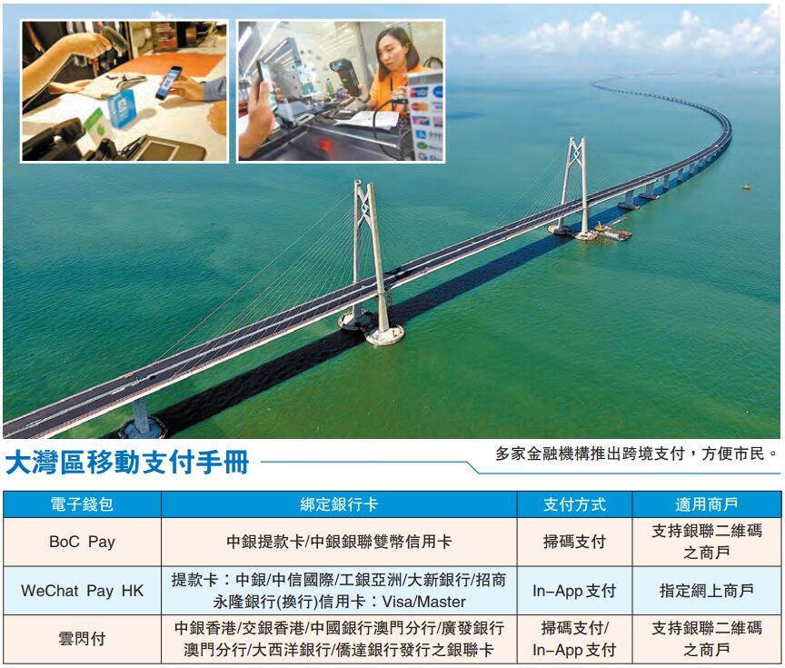 高鐵香港段及港珠澳大橋相繼開通,粵港澳大灣區形成一小時生活圈,港人赴大灣區旅遊更加方便。為滿足港人到大灣區內地城市消費需要,多家金融機構和電子錢包營運商紛紛推出跨境電子支付服務,令港人在內地消費一樣可以使用香港的銀行卡或電子錢包。