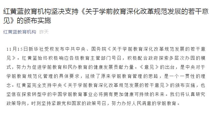 针对11月15日晚间出炉的《学前教育深化改革规范发展的若干意见》新政,红黄蓝随后在其公众号发表了名为《红黄蓝教育机构坚决支持《关于学前教育深化改革规范发展的若干意见》》的文章。