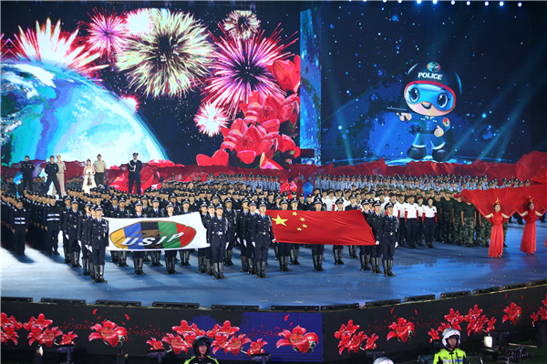 在国际警体联的会歌声中,会旗徐徐升起,运动员、裁判员代表分别宣誓。随后,以“英豪显神威”为主题的开幕式表演环节精彩上演,包括《力·推演岁月》《防暴攻略》《极限技能》《综合演武》《铿锵玫瑰》《爱·把握未来》等篇章,表演从四个方面切入:赋予正义之魂,彰显射击之技,舞动艺术之翼,绽放梦想之花。旌旗猎猎,由警察组成的锣鼓队以激越的鼓点、铿锵的节奏抒发新时代的从警豪情;狮舞高桩反映中国警察气势如虹的豪情、奋发图强的精神;超百人的枪操战术演练呈现多元方阵,展示先进高能警用装备。表演在五大洲警察代表向天空射击,由200架无人机组成的“天空靶环”演变成一只展翅飞翔的巨大和平鸽中落下帷幕。整个表演具有整体性、故事性和情节性,将职业性、专业性、艺术性和观赏性融为一体,环环相扣,引人入胜,富有警队特色、充满力量之美、蕴含力量之魂,展现全球视野、中国气派、岭南特色,展示了中国警察打击犯罪、维护正义的坚强实力和美好愿景。在未来5天,来自世界73个国家和地区的256名参赛选手将同台竞技,共同比拼,共享欢乐,充分展现世界警察的精湛技能和良好形象。