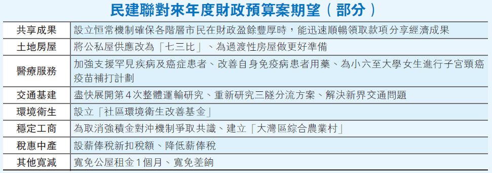 民建聯以「善用儲備利民生.靈活應對穩經濟」為題,向財政司司長提出對2019至2020年度《財政預算案》的期望,於土地房屋、醫療服務、交通基建、穩定工商促經濟等多方面,提出共155項建議。他們又要求政府繼續爭取社會共識,多管齊下開拓土地,並要善用豐裕的財政儲備,以「應使則使」的原則,推出更多利民紓困的措施,改善市民生活環境。