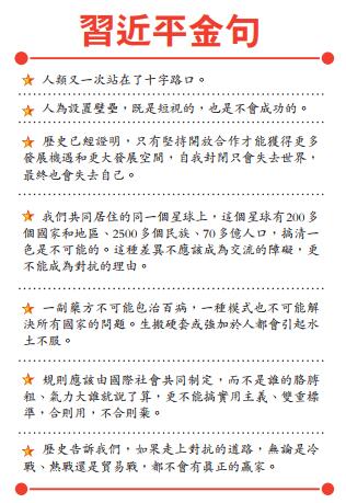 習近平強調,在當今世界經濟風起雲湧、風險挑戰凸顯的形勢下,我們同在一條船上,一起謀劃發展合作,具有特別的意義。合作還是對抗?開放還是封閉?互利共贏還是零和博弈?如何回答這些問題,關乎各國利益,關乎人類前途命運。