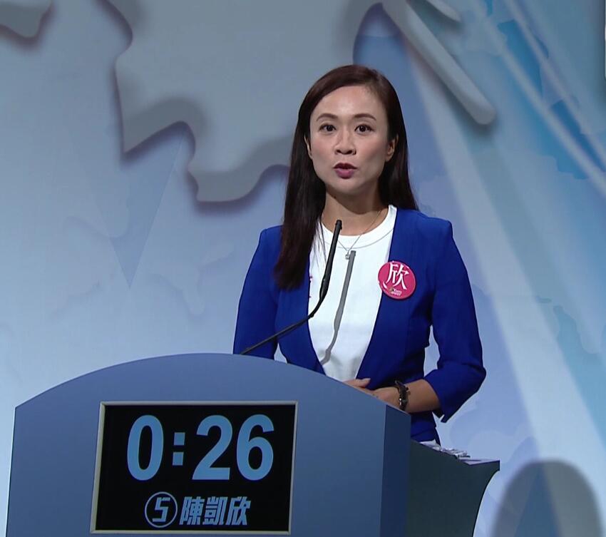 在選舉論壇上,陳凱欣雖然被圍攻,但仍然表現鎮定大方,不時以銳利的辭鋒據理力爭反駁對手。她發言說,自己與所有香港人一樣關心長者、醫療、教育與住屋等民生問題,亦形容自己是議會新力量,香港新希望,有別於部分曾在議會多年都無作為的候選人,希望大家多多支持自己;她特別指出,與許多建制派的參選人一樣,參選以來團隊不斷被挑釁及打壓,目前選情嚴峻。
