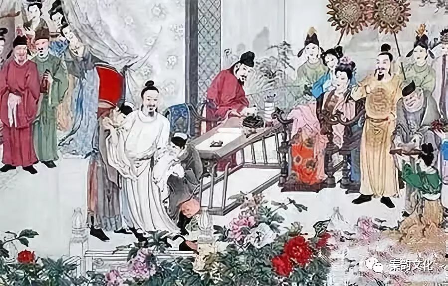 然而贵为皇帝身边的人,但并非重用,只是充当了娱乐功能的诗人。为杨贵妃写的三首《清平调词》,就是李白在长安供奉翰林时所作。一日,玄宗和贵妃在宫中观牡丹花,当时李白喝醉酒躺在酒楼,李龟年赶紧用冷水激醒他,叫人把李白架进兴庆宫,半醉半醒的李白被奉命写下赞美杨贵妃的诗。才有了大家所知的高力士给李白脱靴,杨国忠给研墨的故事。