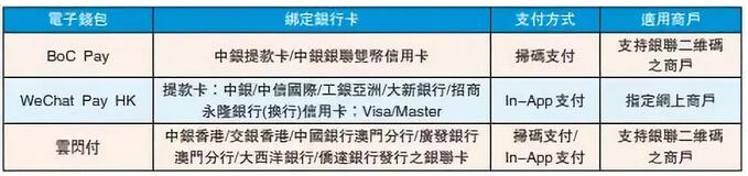 支持跨境移动支付的香港电子钱包中,BoCPay只能绑定中银卡,同时只接受银联二维码商家;WeChatPayHK只可用于指定网上商户,均有一定局限性。要数目前性能相对全面的跨境支付电子钱包,非银联推出的云闪付app莫属。