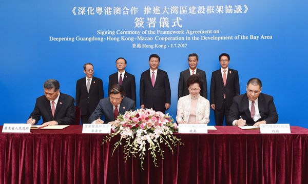 习主席表示,港澳同胞在国家改革开放中发挥「先行先試的試點作用」,从CEPA到如今的粤港澳大湾区建设,港澳与内地在国际经贸事物中的合作进一步加强。图为2017年7月1日习近平见证大湾区建设协议签署。