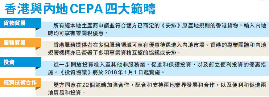其中,內地的新經濟周期,為香港傳統支柱行業以及旅遊、零售、食宿等產業鏈,都能帶來難以預估的新增長空間。香港則擁有高度國際化的服務機構體系、現代化服務設施和相當高的專業化服務程度,並擁有各類國際性服務人才,以及健全的服務業制度。隨着CEPA的實施,香港與內地在專業人才的資格認定上彼此互認,人才交流日益頻繁,香港眾多的會計、管理、法律等專業人才進入內地相關領域,頻繁的人才交流有力地促進了香港與內地的經濟發展。