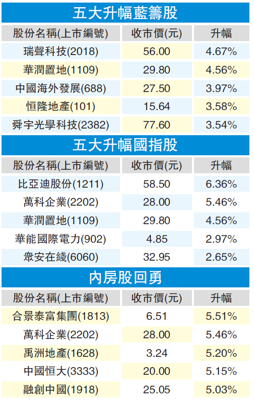 有分析指出,內地經濟有下行壓力,預料明年調控政策將會放鬆,其中包括貸款利率及首期都會有所調整,內房股普遍造好,華潤置地(1109)升4.56%收29.8元;中海外(688)漲3.97%,報27.5元;碧桂園(2007)走高2.74%,收9.38元;融創(1918)急升半成,報25.05元;萬科企業(2202)亦漲5.46%,報28元。而藍籌新地(016)造好收報110.10元,升幅3.28%。