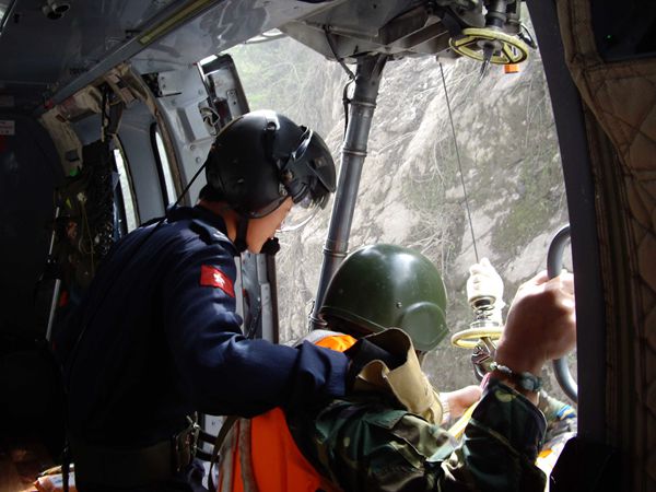 香港飛行服務隊拯救隊伍在四川汶川地震災區中搜索兩位失蹤礦工。