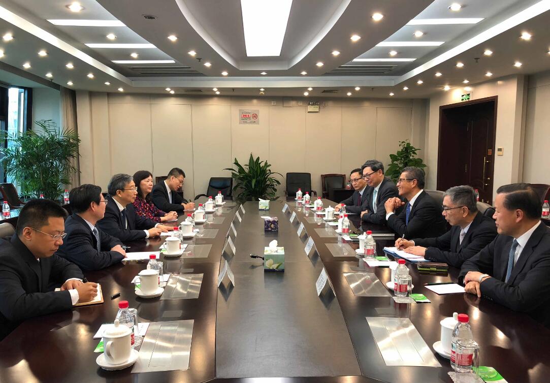 最後,他們一行拜訪國務院國有資產監督管理委員會副主任沈瑩,陳茂波期望能鼓勵內地企業多利用香港為「一帶一路」基建項目融資和在香港設立專屬自保保險公司,為其海外業務安排保險以完善風險管理系統。