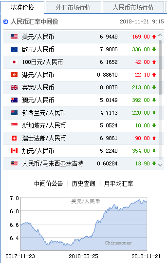 11月21日,美联储加息步伐料放缓,人民币(6.9475, 0.0022, 0.03%)中间价报6.9449,下调169点,上一交易日中间价报6.9280,在岸人民币上一交易日收报6.9393。