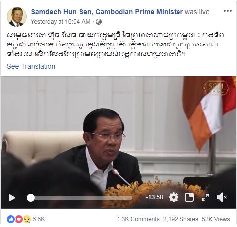 而在亲自辟谣的同时,这位柬埔寨首相还在自己的社交媒体上对这场会议进行了直播。