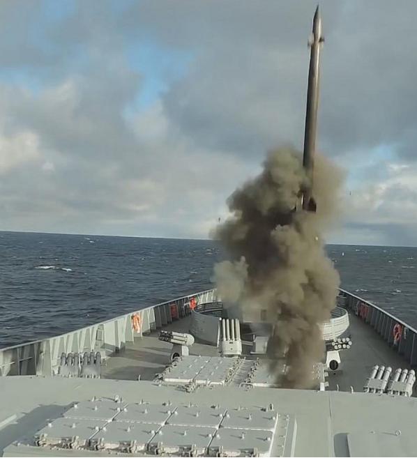 22350型护卫舰是俄罗斯海军最先进的战舰,排水量4500吨,航速29节,装备有“宝石”和“口径”(P-800反舰导弹和3M54\3M14巡航导弹)导弹,以及“多面堡”防空系统(9M100防空导弹)。