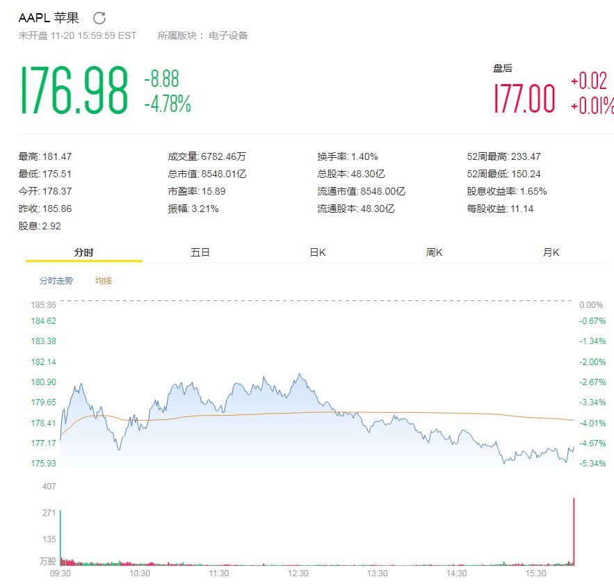 上述高盛报告发布后,苹果股价本周二低开4%,盘初一度跌破176美元,创今年5月3日以来新低,跌幅一度超过5.5%,最终收跌4.78%,收报176.98美元,同样收创今年5月3日以来新低。以收盘价算,今年以来苹果股价涨幅收窄到不足2.8%,一个月来累跌近20%。