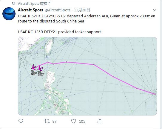 長期跟蹤美軍戰機動態的推特賬號美國「飛機守望」也披露了這一信息,並發布上述轟炸機在南海的飛行線路圖。「飛機守望」稱,在上述行動中,美軍的KC135R加油機都進行了伴飛。