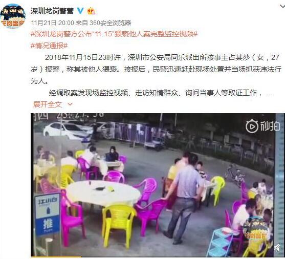 2018年11月15日23时许,深圳市公安局同乐派出所接事主占某莎(女,27岁)报警,称其被他人猥亵。接报后,民警迅速赶赴现场处置并当场抓获违法行为人。